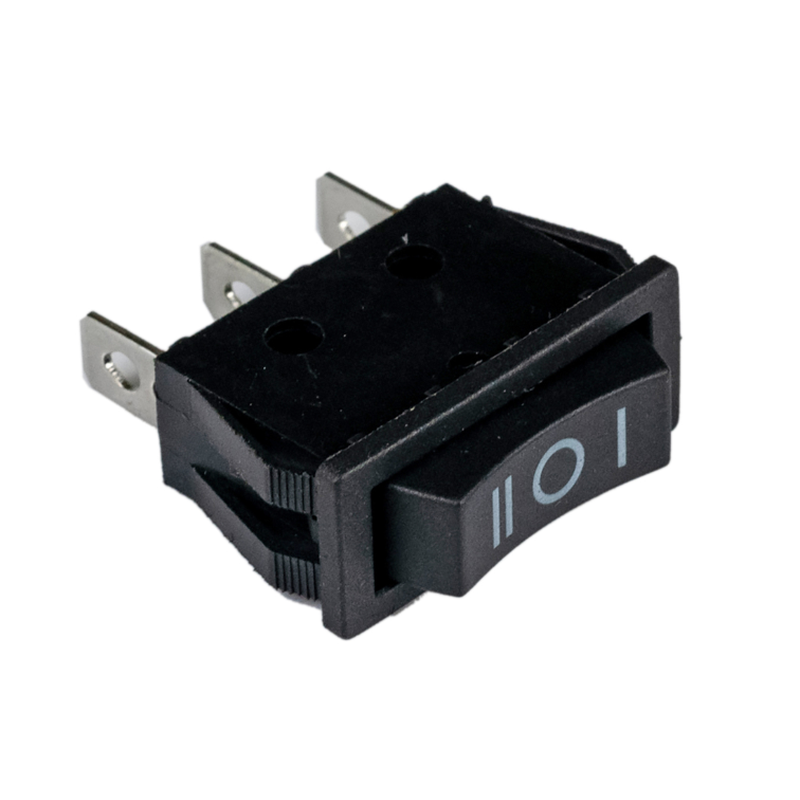 Komutator unipolar me buton të zi, i përdorur për kontrollin dhe ndryshimin e funksioneve në pajisje elektrike dhe elektroshtepiake. Ky komutator ka pozicion të fikur në mes, duke lejuar kontroll të thjeshtë dhe të sigurt të funksioneve të pajisjes.