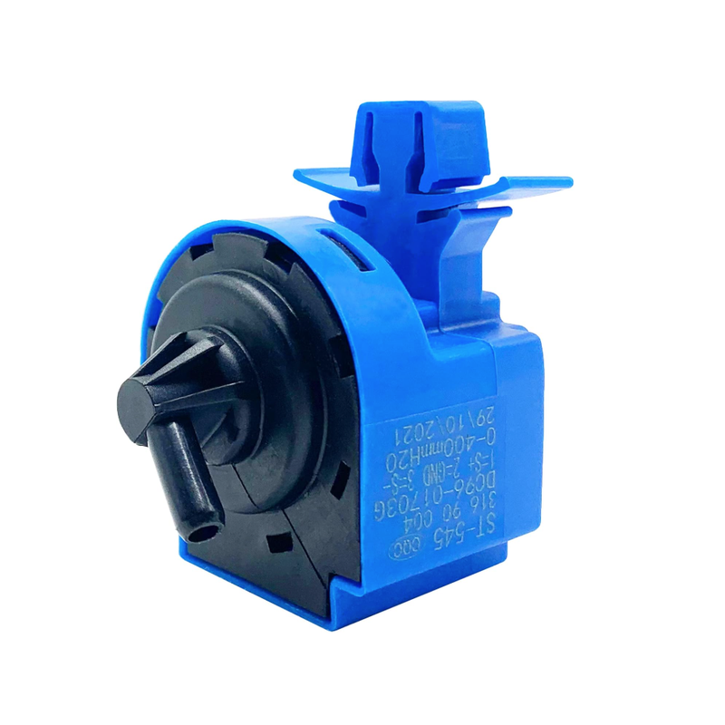 Presostat për lavatriçe që shërben për të kontrolluar nivelin e ujit gjatë funksionimit të pajisjes. Ky komponent mat presionin e ajrit nga tubi i nivelit të ujit dhe dërgon sinjale në sistemin elektronik për të rregulluar mbushjen dhe ndalimin e ujit gjatë ciklit të larjes.